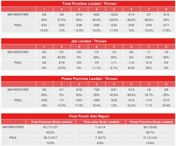 Paul and Mayweather delivered the same number of jabs 7 while the 44-year-old landed more power shots -. However punch stats released by Showtime after the final bell have indicated that Mayweather got the better of the action. The bout went the full.